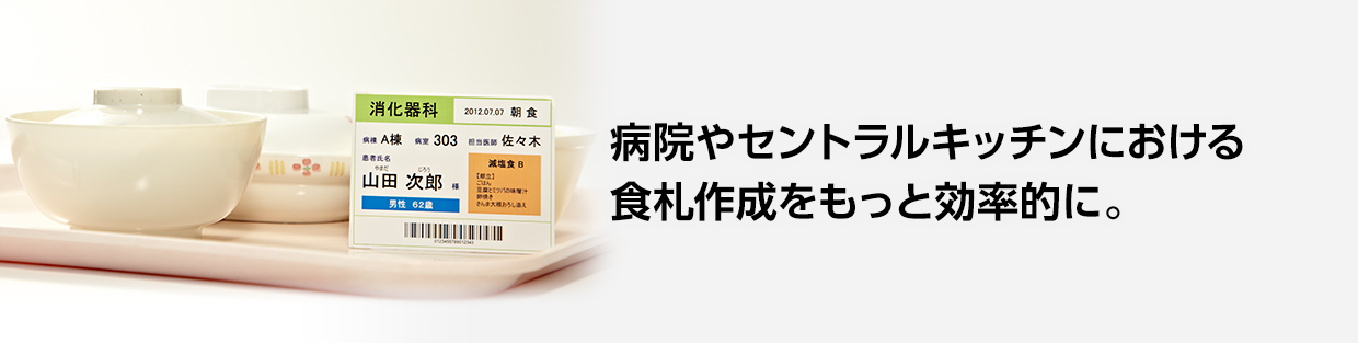 患者の名前、献立内容などを記載した入院患者の食事にセットされる食札。内容ごとの見やすさだけでなく、出力後の仕分け作業が大きな課題でした。キヤノンのラベルプリンターなら、配膳時にセットする順番でラベル発行が可能です。