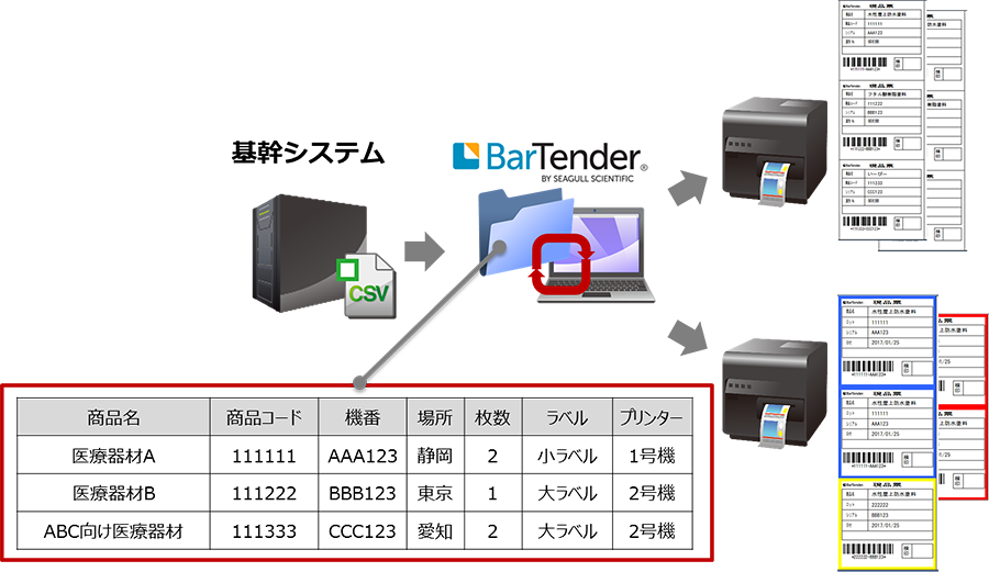 さらに、カラーラベルプリンターには、自動ラベル印刷の仕組みもございます。自動ラベル印刷は、基幹システムからCSVファイルを指定したフォルダーに保存すると、自動で指定したラベルにデータを差し込みし、指定したプリンターに印刷することができます。