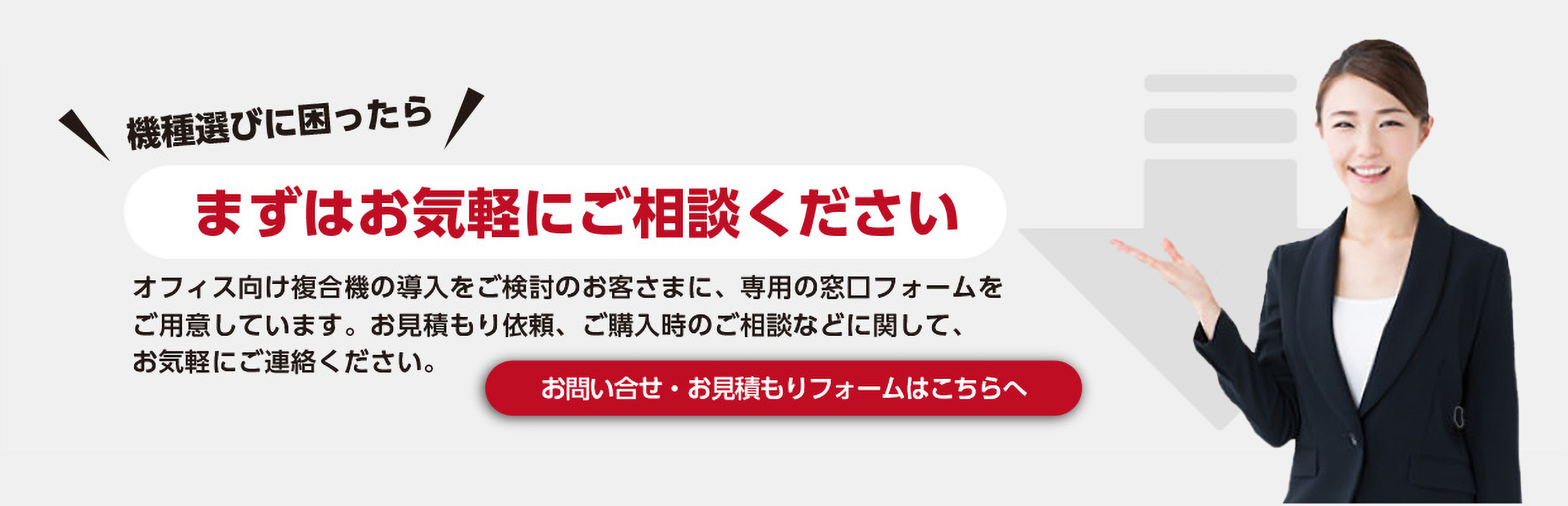 オフィス向け複合機の導入をご検討のお客さまに、専用の窓口フォームをご用意しています。お見積もり依頼、ご購入時のご相談などに関して、お気軽にご連絡ください。