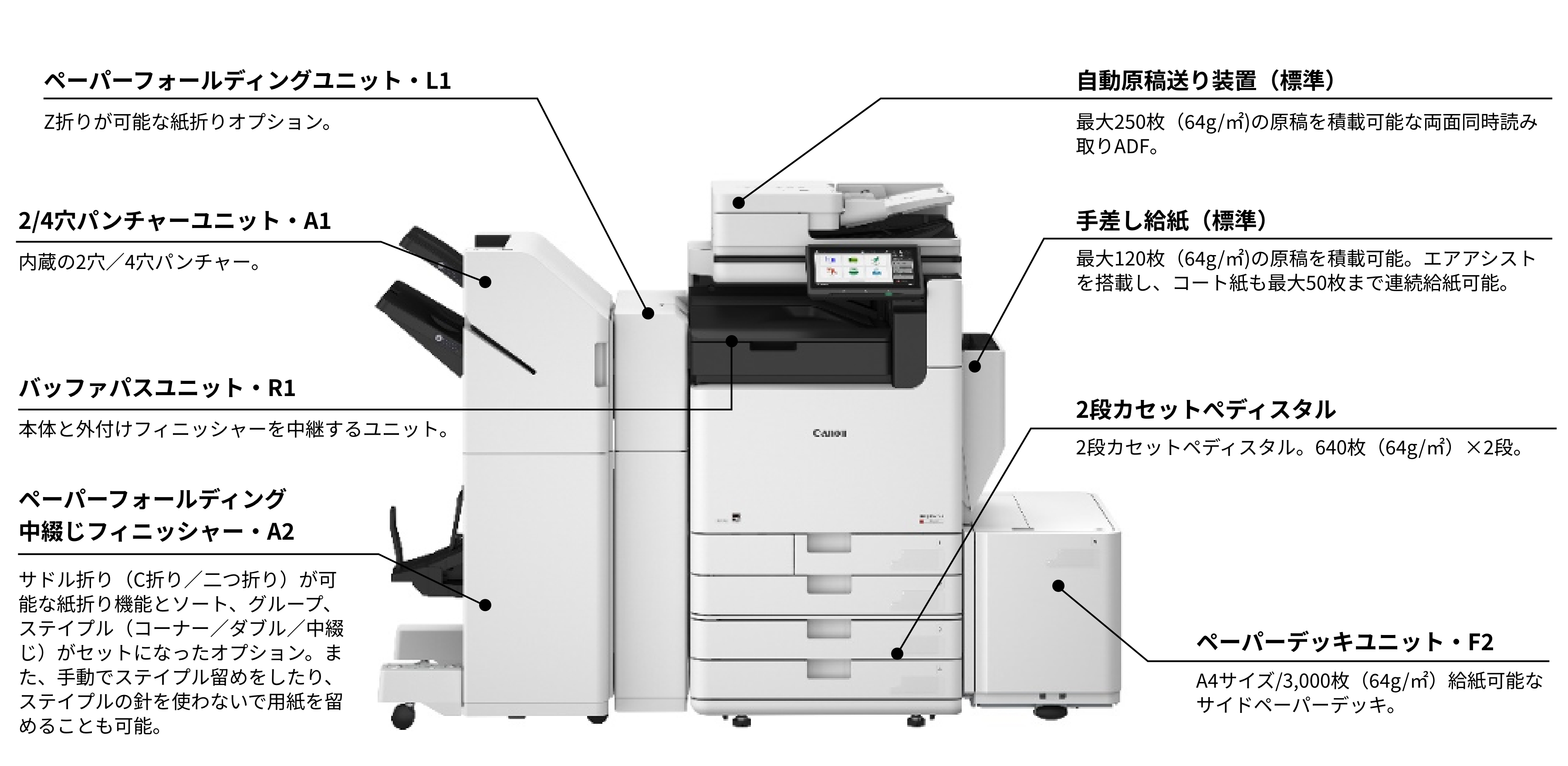 | ペーパーデッキユニット・F2 | 6595C001 | 260,000円 | 3,600円 | A4サイズ/3,000枚(64g/m²)給紙可能なサイドペーパーデッキ。本体から電源を供給します。取付にはペーパーデッキ取付けキット・A1が必要です。 | |