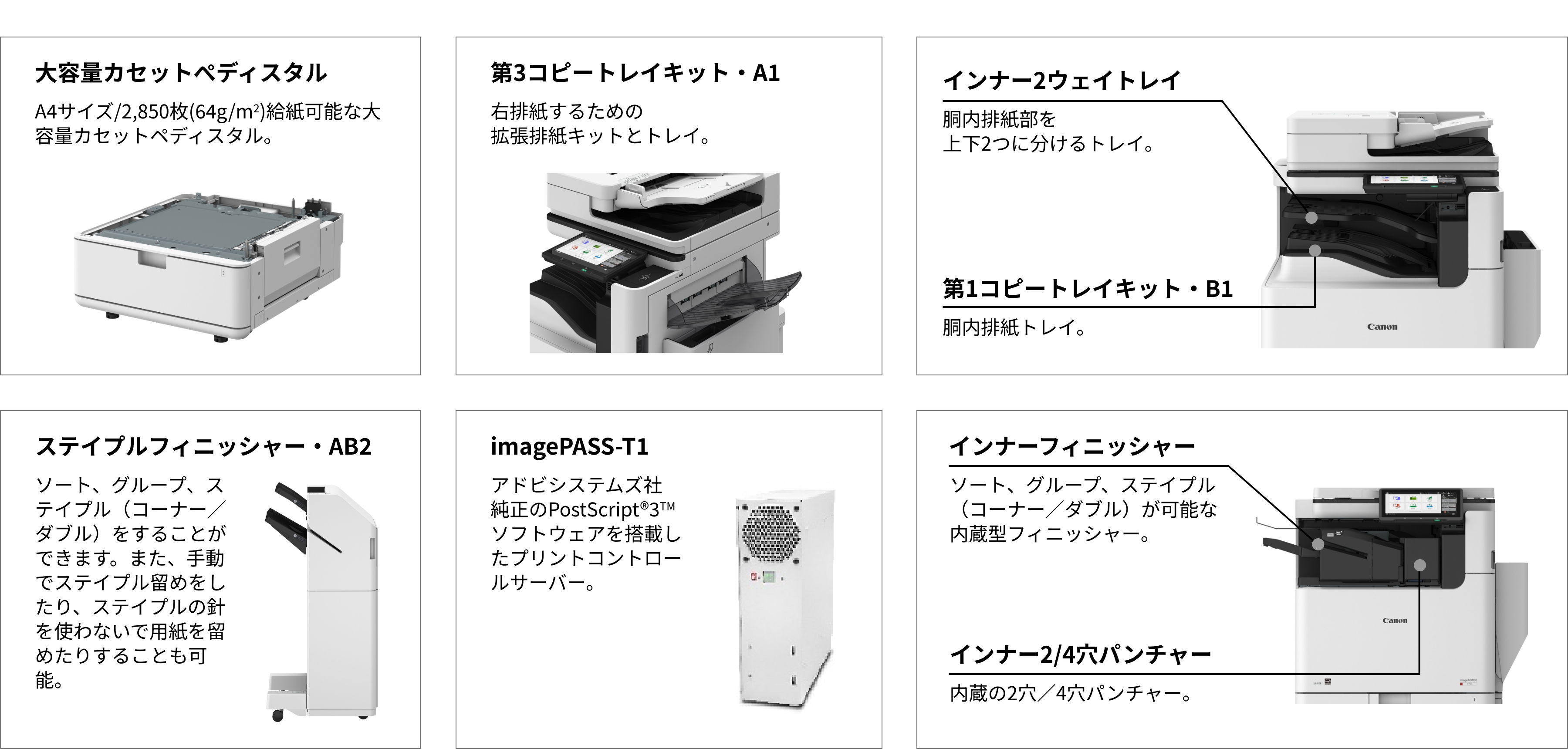 | imagePASS-T1 | 6828C003 | 950,000円 | 9,000円 | アドビシステムズ社純正のPostScript 3ソフトウェアを搭載したプリントコントロールサーバー(本体背面に取付け)。PostScriptアプリケーションを使用するユーザーや、大量のプリントを必要とするオフィス環境に最適なオプションです。 別途「imageFORCE C7165 Connection Kit」が必要です。 |