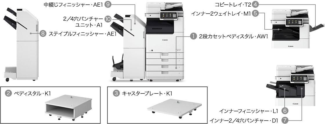 | インナー2ウェイトレイ・M1 | コピートレイ・T2 | インナーフィニッシャー・L1 | ステイプルフィニッシャー・AE1 | 中綴じフィニッシャー・AE1 | ||