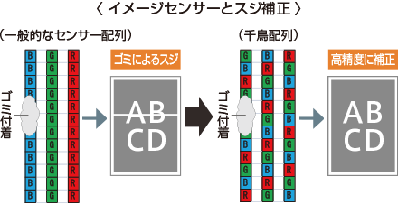 原稿読み取りガラス表面に、糊や修正液、インクなどが付着しにくい防汚処理を施したコートガラスを採用。ゴミの付着を抑制します。さらに、独自の千鳥配列イメージセンサーと画像処理技術により、ゴミによるスジを高精度に検知し細かく補正。高品位なスキャン画像を得るとともに、再スキャンの手間を減らしてユーザーストレスを低減します。