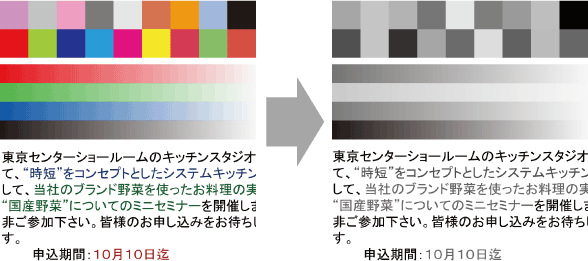 文字・図形・写真のすべてに、自然な階調特性を発揮。モノクロでありながら、画像の濃淡や明暗までもなめらかに表現できます。