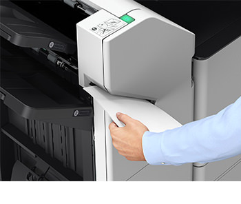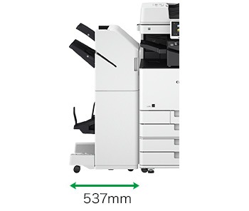 オプションの「中綴じフィニッシャー・AE1」は、コーナー/2ヵ所綴じ、中綴じに加え、針なしとじ、マニュアルステイプルにも対応。また、内蔵型の「2/4穴パンチャーユニット・A1」を装着することでパンチ機能を拡張することも可能です。さらに、性能強化のみならず幅537mmと大幅なコンパクト化を実現し、さまざまな仕上げ機能を省スペースで提供します。