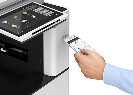 10.1inch、フルフラットのタッチパネルを採用。ソフトキーへのタッチのみで操作が完結するハードキーレス設計と、本体右側に配置したICカードリーダー部※1により、最短の視線移動と手の動線を実現します。操作パネル前面のLEDは発光面積を拡大し、離れた場所からでも見やすく、近くでは眩しさを抑えた設計です。また、従来と同様な操作感を提供するハードテンキーもオプションで用意しています。