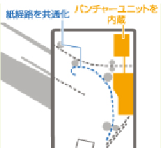 中綴じ、針なしとじ/マニュアルステイプルなどの仕上げ機能を拡張するフィニッシャーを、用紙経路を共通化してコンパクト化しています。