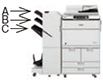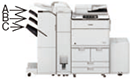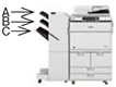写真はiR-ADV 6780に、「中綴じフィニッシャー・AC2」、「2/4穴パンチャーユニット・A1」、「ペーパーフォールディングインサーターユニット・J1」、「PODデッキライト・C1」を装着したものです。