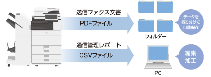 送信済のファクスデータを画像化し、送信日時や送信元情報などを付与して本体SSDや外部サーバーへ自動保存します。また通信管理レポートは、プリントはもちろん、CSVファイルとして電子化してPCで管理、編集・加工が可能です。履歴確認もスムーズに行えます。
