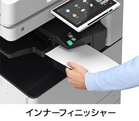 オプションの「中綴じフィニッシャー・AB1」は性能を強化し、最大で20枚(81.4g/m2)までの中綴じに対応。「ステイプルフィニッシャー・AB1」とともに、針なしとじ、マニュアルステイプルも可能です。省スペースタイプの「インナーフィニッシャー・L1」※2なら本体幅を変えることなく、ステイプル(コーナー綴じ/2ヵ所綴じ)、針なしとじ(10枚)、マニュアルステイプルに対応。さらに、「インナー2/4穴パンチャー・D1」※2を装着してパンチ機能を拡張できます。
