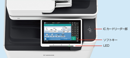 10.1inch、フルフラットのタッチパネルを採用。ソフトキーへのタッチのみで操作が完結するハードキーレス設計と、本体右側に配置したICカードリーダー部※1により、最短の視線移動と手の動線を実現します。操作パネル前面のLEDは発光面積を拡大し、離れた場所からでも見やすく、近くでは眩しさを抑えた設計です。また、従来と同様な操作感を提供するハードテンキーもオプションで用意しています。