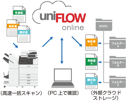 ファイリングアシストのファイリングの機能はuniFLOW Onlineの有償サービスです。外部クラウドストレージは別途契約が必要となる場合があります。