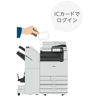 本体にICカードをかざすだけで手軽にユーザーがログインできるシステムを構築します。複合機に標準搭載された機能と連携して、ユーザー毎に複合機の利用制限を付与するなどユーザーの一括管理が可能です。