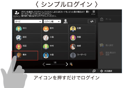 本体の操作パネルから、自分のアイコンをタッチするだけで、手軽にログインできる個人認証管理システムです。