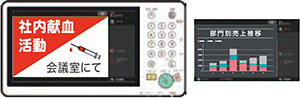 ワイドで見やすい操作パネルを活かし、イベント告知や社内通達などさまざまなビジュアルコンテンツを表示できます。コンテンツはアドバンスドボックスやファイルサーバーに格納。操作開始前のログイン時やプリント中に表示させることが可能です。効果的な情報コミュニケーションを実現します。