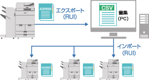 複合機に登録されている宛先表をCSVファイルでエクスポートし、他の複合機に適用することができます。CSVファイルなら宛先データの追加・編集が簡単に行えるため、メンテナンス作業負荷を軽減します。