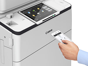 モバイル機器に「Canon PRINT Business」※1をダウンロードし、ダイレクト接続でモバイル機器からのデータ出力、スキャンデータの取り込みが行えます。Bluetooth LE※2により、近くの複合機を検索して簡単に接続可能です。また、NFC※2を追加すれば、モバイル機器を複合機にタッチして印刷できます。留め置き文書の印刷指示や、モバイル機器のEメールアドレスを使った宛先送信にも対応します。