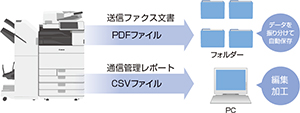 送信済のファクスデータを画像化し、送信日時や送信元情報などを付与して本体HDDや外部サーバーへ自動保存します。また、通信管理レポートはプリントはもちろん、CSVファイルとして電子化してPCで管理、編集・加工が可能です。履歴確認もスムーズに行えます。