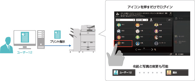 本体にユーザー登録をしておけば、タッチパネル上のアイコンを選択するだけでログイン認証が完了。ユーザー名やパスワードの入力は不要です。プリント指示を送ることで自動的にユーザーアカウントを登録することも可能です。