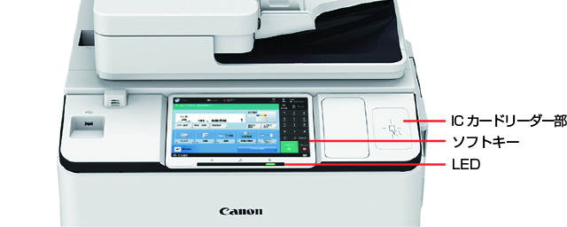10.1inch、フルフラットのタッチパネルを採用。ソフトキーへのタッチのみで操作が完結するハードキーレス設計と、本体右側に配置したICカードリーダー部*1により、最短の視線移動と手の動線を実現します。操作パネル前面のLEDは発光面積を拡大し、離れた場所からでも見やすく、近くでは眩しさを抑えた設計です。また、従来と同様な操作感を提供するハードテンキーもオプションで用意しています。