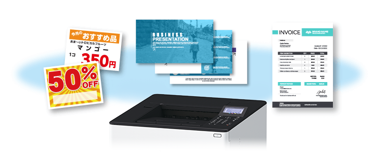 鮮やかでくっきりとした高精細なプリントを実現。POPやプライスカード、プレゼン資料など、キレイに仕上げることができます。またグラフィカルな表現だけでなく、ビジネス文書の細かい文字もにじまずにしっかりと印刷可能です。