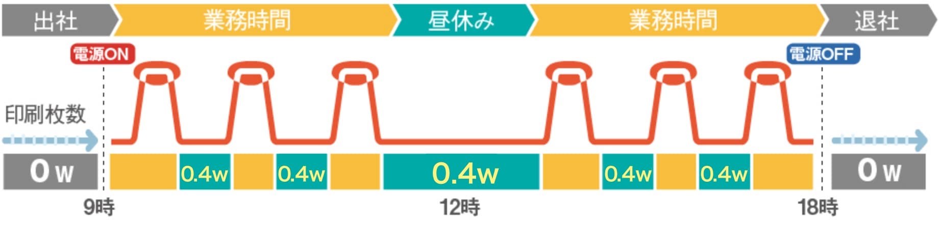 プリンターの使用がないときは自動でスリープモードに切り替わり、最小0.4Wまで消費電力を抑えることができます。また、急にプリントが必要なときもクイックウェイクアップにより、素早くスリープから立ち上がり出力をスタート。業務をスムーズにこなしながら、電力消費を徹底的に削減できます。