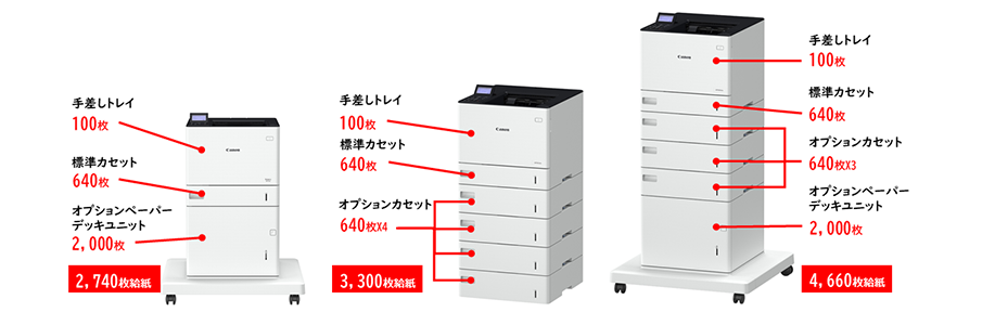 オプションカセットは最大4段、ペーパーデッキユニット装着時は最大3段まで装着可能。ペーパーデッキユニットは、下段のみ装着可能。