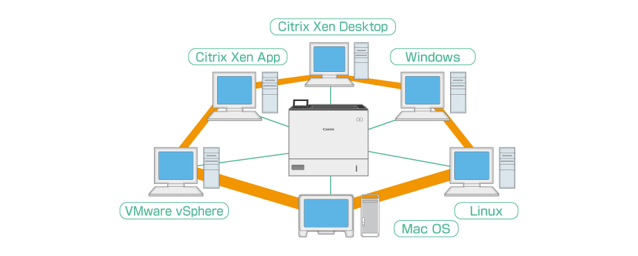 Windowsはもちろん、Mac OSやLinuxなどの多様なOSに対応。異なるOSが混在したネットワーク環境の共有プリンターとして、オプション不要で導入できます。また、Citrixの仮想化ソリューションなどにも対応します。