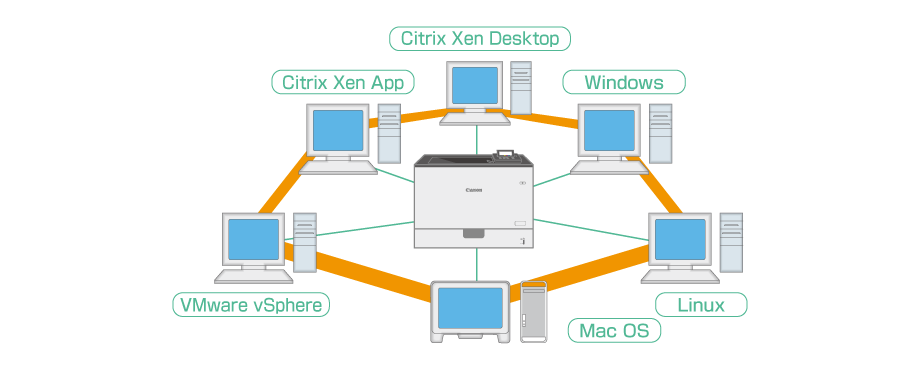 Windowsはもちろん、Mac OSやLinuxなどの多様なOSに対応。異なるOSが混在したネットワーク環境の共有プリンターとして、オプション不要で導入できます。また、Citrixの仮想化ソリューションなどにも対応します。