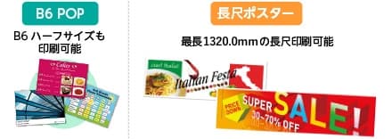 手差しトレイを使用し、最長1320.0mmの長尺印刷からB6ハーフサイズ(64×182mm)まで対応。今まで外部発注していた長尺ポスター、店頭POP、プライスカードなどの販促ツールを内製可能です。製作時間の短縮や、外注費の経費削減にも貢献します。
