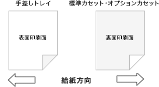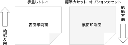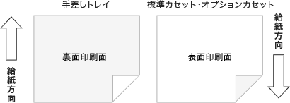 手差しトレイや標準カセットを使用する場合、用紙を縦に向けて印刷面を上にしてセットします。