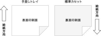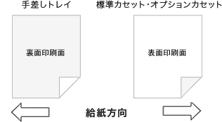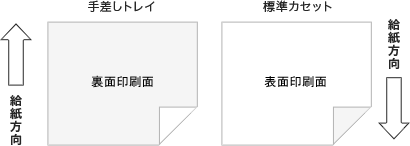 手差しトレイや標準カセットを使用する場合、用紙を縦に向けて印刷面を下にしてセットします。