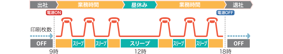 プリンターの稼働が止まり設定した移行時間になると、自動で低消費電力のスリープモードに切り換わります。ムダな消費電力を徹底的に抑えながら、印刷が必要なときには素早くプリントを開始します。