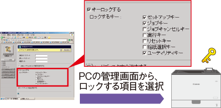 本体の操作パネルをロックして、ユーザーによる設定変更を防止できます。ロックするキーは「リモートUI」から容易に選択可能です。