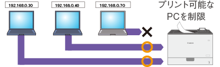 プリンター接続の許可/拒否をIPアドレス、MACアドレスで制限できます。特定ユーザーだけが印刷できる環境を構築できます。