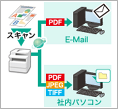 パソコンのスキャナードライバーを使わずに本体操作でスキャニングが可能。高圧縮PDFに対応し、社内外へのデータ共有に便利です。