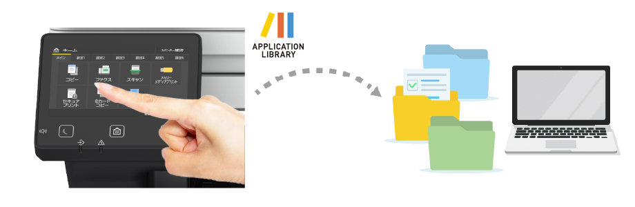 アプリケーションライブラリを利用して、よく使う定型文書などの内容、用紙サイズ、部数などをあらかじめ登録できます。ワンボタンで印刷やFAX送信でき、問診票などの定型書類の登録や、チラシやお知らせなどの一斉送信などに便利です。
