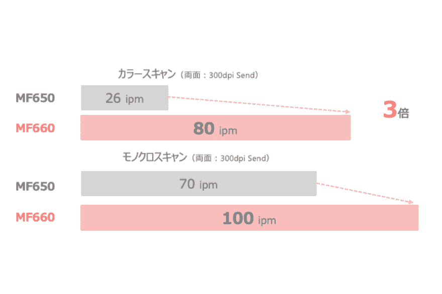 カラー80ipm、モノクロ100ipmの速度で高速スキャン。読み取り用紙サイズも、A4・A5サイズのみでなく、A6や名刺サイズも可能。様々なスキャンニーズへ対応が可能です。