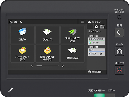 迷いのない直感的な操作を実現する、7インチのカラー液晶タッチパネル。パネルに直接タッチしたり、フリック操作で多彩な機能をスムーズに使いこなすことができます。日常業務に合わせてメニュー画面をカスタマイズすることも可能です。