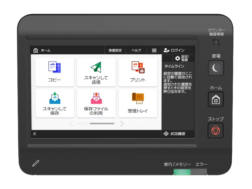 迷いのない直感的な操作を実現する、7インチのカラー液晶タッチパネル。パネルに直接タッチしたり、フリック操作で多彩な機能をスムーズに使いこなすことができます。日常業務に合わせてメニュー画面をカスタマイズすることも可能です。