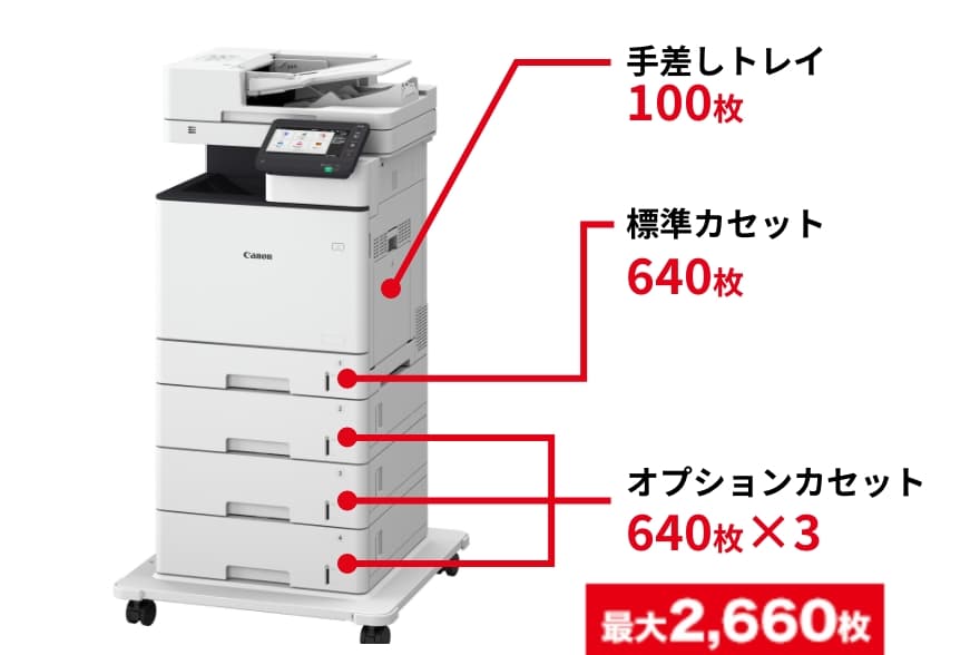 標準カセット640枚、手差しトレイ100枚、オプションの640枚ペーパーフィーダーを装着すれば最大4段・2,660枚の大容量給紙を実現します。A4/B5/A5/A6など異なる用紙・サイズを同時にセットでき、大量のプリント業務も効率的に行えます。
