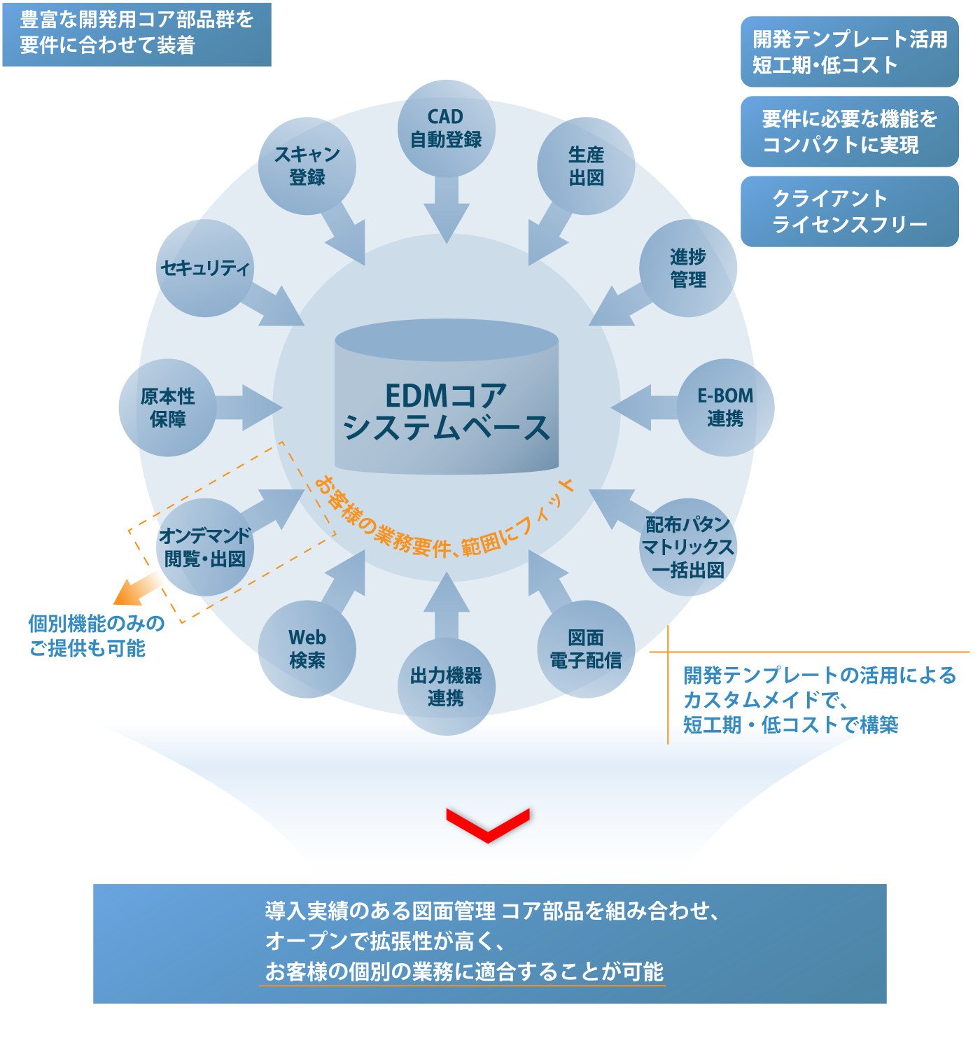 過去に導入実績のあるさまざまなEDMコアを組合わせることにより、オープンで拡張性が高く、お客さま個別の業務に適合したシステムを、短工期、低コストで構築することが可能です。