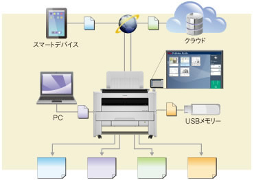 クラウド、イントラネットワーク、スマートデバイス、USBメモリーからの出力が可能です。お客さまのニーズに合わせてプリントできます。