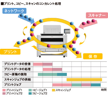 マルチタスク処理機能により、プリント、コピー、スキャンといった別々の業務を同時並行で処理。プリント中でも完了を待つことなく、スキャナーから次の作業を開始できるため、無駄な待ち時間を減らし、生産性はさらに高まります。また、複数のユーザーから同時にデータを受信したり、出力の優先順位を変更したりといった処理プロセスも同時並行で行うことができます。