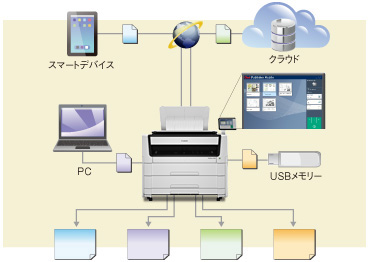 クラウド、イントラネットワーク、スマートデバイス、USBメモリーからの出力が可能です。お客さまのニーズに合わせてプリントできます。