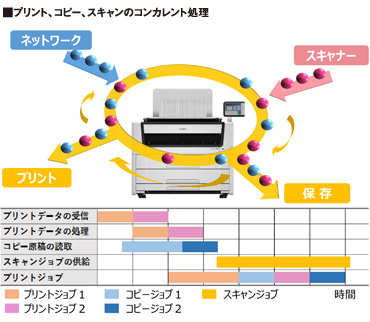 マルチタスク処理機能により、プリント、コピー、スキャンといった別々の業務を同時並行で処理。プリント中でも完了を待つことなく、スキャナーから次の作業を開始できるため、無駄な待ち時間を減らし、生産性はさらに高まります。また、複数のユーザーから同時にデータを受信したり、出力の優先順位を変更したりといった処理プロセスも同時並行で行うことができます。