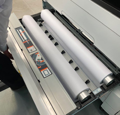 最長200m巻きのロール紙をセットできます。同一種類、同一サイズであれば、自動用紙切替により、標準で400m(2本×200m)、オプションのロール段を一段追加すると最大800m(4本×200m)までの連続出力が可能となり、用紙交換の手間が省け業務効率が向上します。