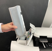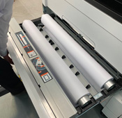 引き出しを開け、用紙をロールホルダーにセットするだけ。用紙のフィード、サイズ判定はマシンが自動で行い、ボタンを押すと用紙先端をきれいにカットします。各用紙段ごとに独立したカッターを所有しており、出力サイズに伴う用紙ロールの交換動作が無く、ロスタイムがありません。