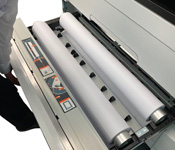 引き出しを開け、用紙をロールホルダーにセットするだけ。用紙のフィード、サイズ判定はマシンが自動で行い、ボタンを押すと用紙先端をきれいにカットします。各用紙段ごとに独立したカッターを所有しており、出力サイズに伴う用紙ロールの交換動作が無く、ロスタイムがありません。