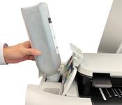マシン上部の手の届きやすい位置にあり、簡単に印刷用紙を取り出せるトップデリバリートレイ。エアー式分離機能により、最大100枚までのドキュメントを整列性よく本体上部に排紙するので、用紙の折れや傷みもなく、他の用紙を押し出して床に落とすこともありません。